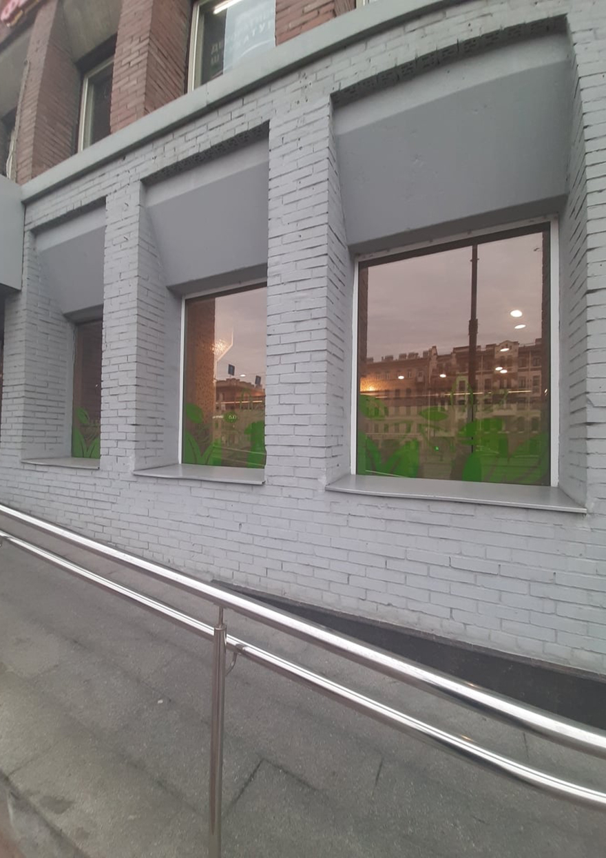 За окнами были выкладки с овощами и фруктами. Задача обеспечить видимость и обезопасить продукцию. Использовали плёнку AIR 75.