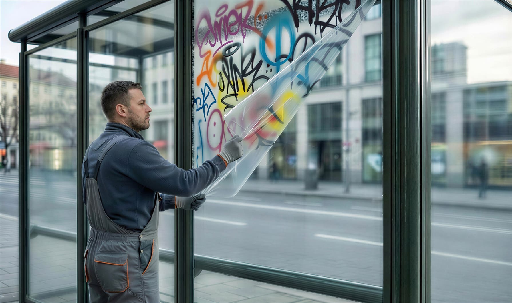 Плёнка принимает на себя агрессивное воздействие маркеров, аэрозольных красок, клея и царапин, сохраняя целостность и внешний вид поверхности под ней.