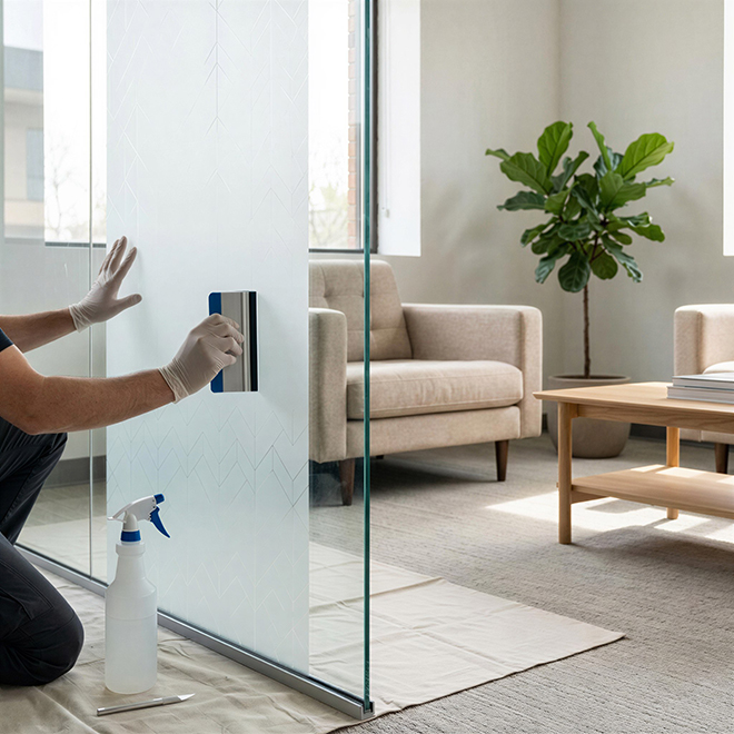 Клеевой слой разработан для интерьерного применения: он обеспечивает надёжную фиксацию без пузырей и отслаивания по кромкам, при этом допускает аккуратный демонтаж без повреждения стекла и без остаточного клея. Благодаря этому декоративное тонирование остаётся полностью обратимым решением, удобным для редизайна и перепланировок.