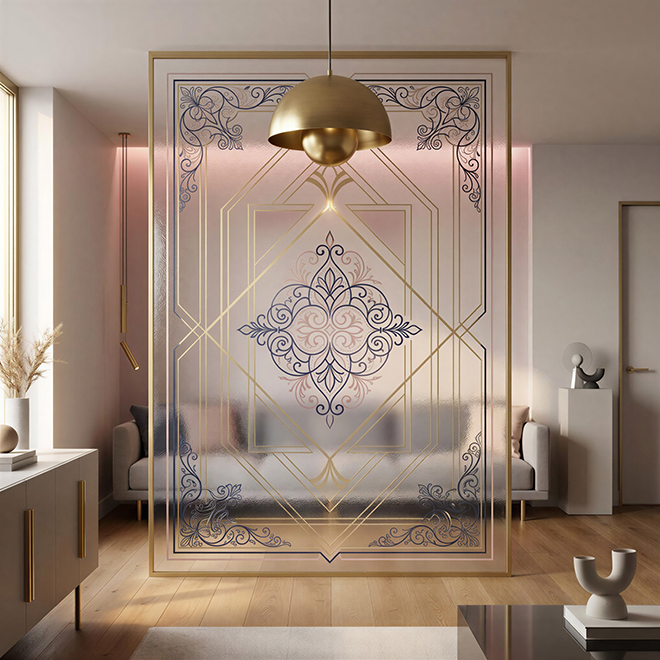 Декоративные плёнки представляют собой многослойные материалы, разработанные для интерьерного применения. Они равномерно наносятся на стеклянные поверхности, не нарушают их геометрию и не создают визуальных дефектов. Поверхность устойчива к прикосновениям, регулярной уборке и воздействию бытовой химии.