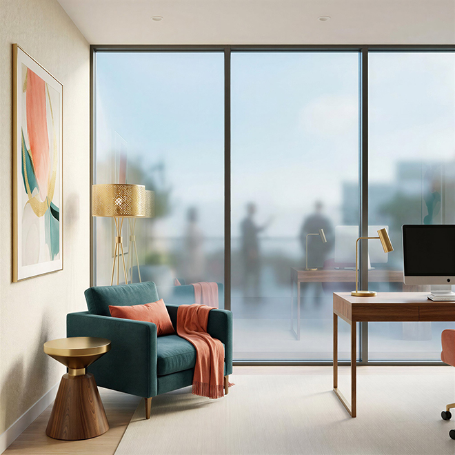 Материал равномерно распределяется по поверхности, не создаёт искажений при прямом взгляде и не влияет на геометрию стеклянных конструкций. Плёнка устойчива к влаге, перепадам температур и регулярной уборке, не выгорает и не теряет своих свойств со временем.